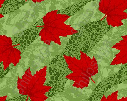 Seamless pattern of red maple leaves scattered on a green background. This classic autumnal design could be used for a variety of purposes, such as wallpaper, fabric for clothing or upholstery, or gift wrap.