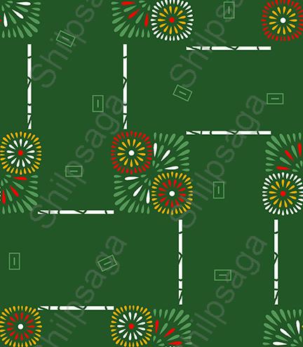Seamless pattern of colorful fireworks exploding in various shapes and sizes on a green background. This festive pattern is ideal for fabrics, gift wrap, and other celebratory designs.