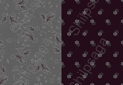 Seamless pattern with gray and purple leaves and dots on a light purple background. This type of pattern is often used for fabrics, wallpaper, and gift wrap. The design creates a modern and elegant look