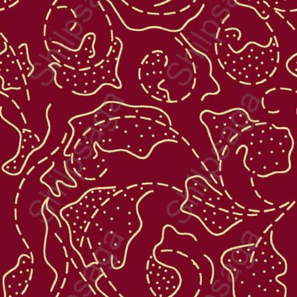 Seamless pattern of lines and dots on a red background. The lines are wavy and appear to be drawn freehand, and the dots are small and scattered throughout the design. This pattern could be used for wallpaper, fabric, or other surfaces that need a decorative red background.