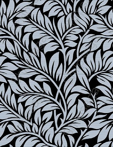 Seamless pattern with black and white pattern with leaves on a striped background. This repeating pattern creates a sense of movement and texture. This design could be used for fabric, wallpaper, wrapping paper or other surfaces that need a seamless pattern.