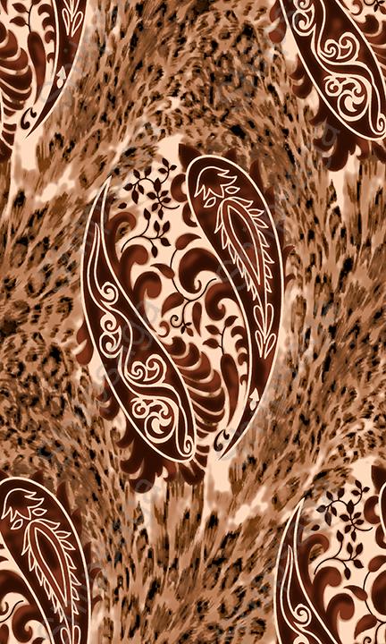 Seamless pattern that combines a leopard print with a paisley design. The design features brown leopard spots and colorful paisley shapes in shades of blue, pink, and yellow on a cream background. This bold and eye-catching pattern could be used for a variety of applications, such as clothing, upholstery, wallpaper, or stationery.
