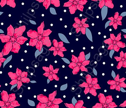 Seamless pattern of pink flowers with white polka dots on a black background. This design could be used for wallpaper, fabric, or other surfaces that need a colorful and cute look.