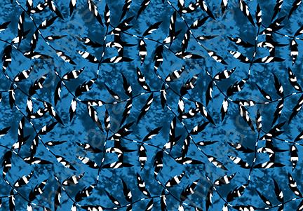 Seamless pattern of black and white leaves on a blue background. The leaves are arranged in a way that creates a sense of movement and flow. This design could be used for fabrics, wallpapers, wrapping paper, or any other application where a leafy pattern is desired.
