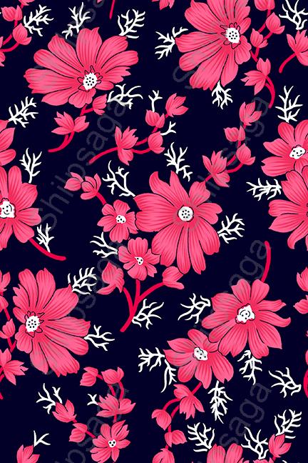 Seamless pattern with pink flowers resembling Transvaal daisies and hibiscuses on a dark blue background. This classic floral design could be used for wallpaper, fabric prints, or other surfaces that need a background.