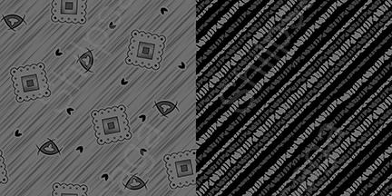 Seamless patterns in black and gray. The first pattern features squares and circles, while the second pattern has lines.These black and gray seamless patterns could be used for a variety of purposes, such as wallpaper, fabric for clothing or upholstery, or packaging.