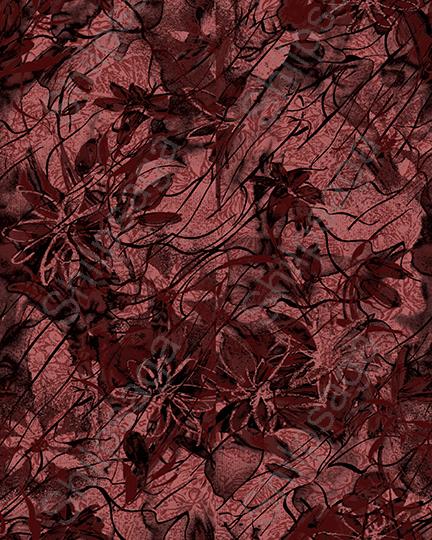 A red background with a pattern of flowers and leaves. The flowers are a simple, geometric design with five petals and appear scattered throughout the design. The leaves are green and also geometric in shape. This floral pattern creates a modern and minimalist look.