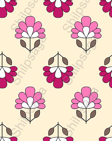 Sseamless pattern features pink and white flowers on a light yellow background. The design creates a sweet and cheerful feel